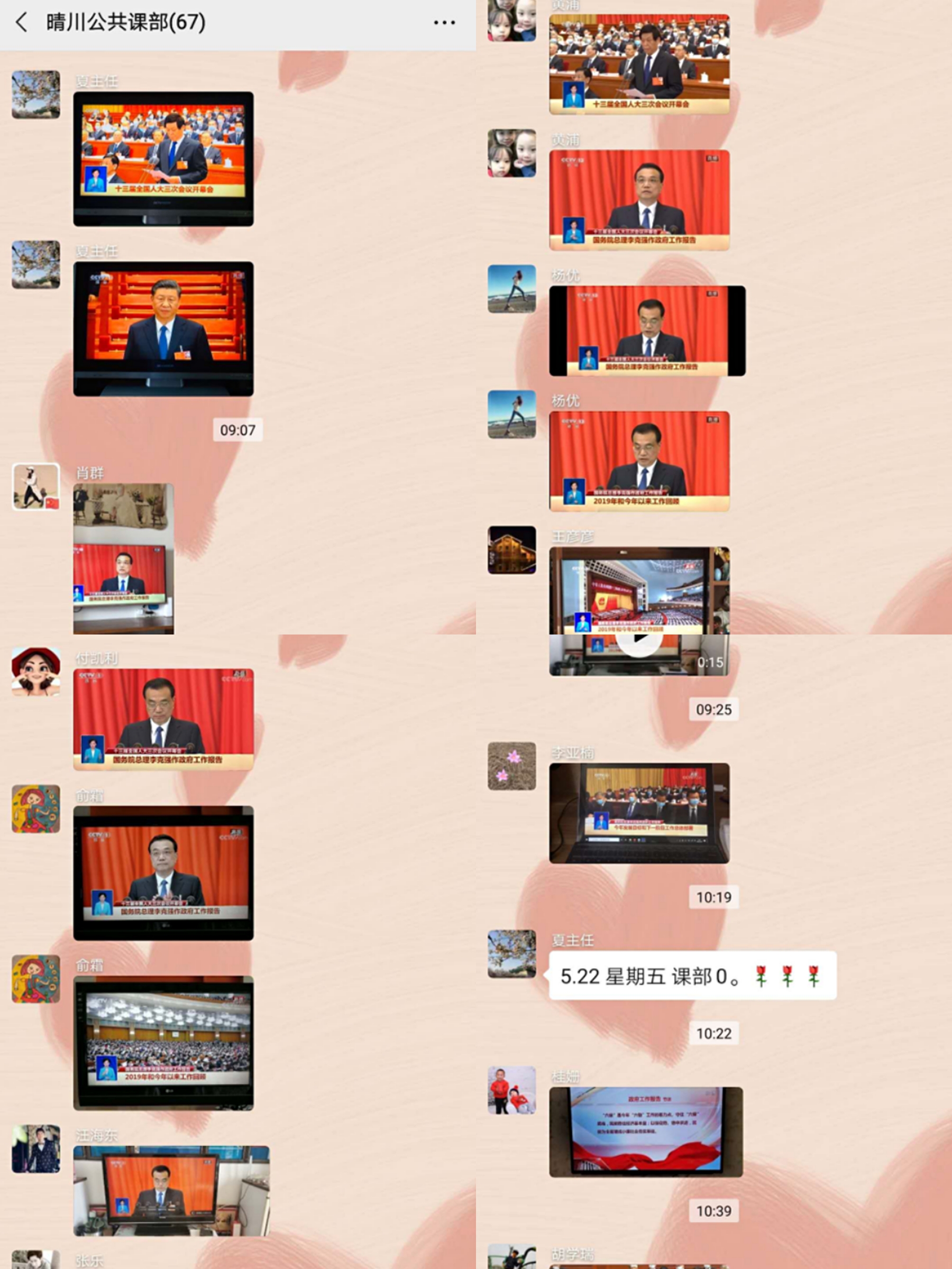 公共课部、思政课部线上集中组织课部党员干部职工于5月22日上午,深入开展学习全国两会精神活动,认真听取了李克强总理作的政府工作报告。收听收看后,大家倍感振奋和鼓舞。收看后进行了热烈讨论,大家一致认为,李克强总理所作的《政府工作报告》是一个求真务实、催人奋进的报告。纷纷表示,我们要扛起新时代责任担当,增强“四个意识”、坚定“四个自信”,坚决做到“两个维护”,把学习贯彻落实全国两会精神和大学教育教学工作有机结合起来,聚焦重点工作,立足工作实际,履职尽责,锐意创新,开拓进取,为实现教育事业发展新突破而努力奋斗,为建设全国一流教学模范单位,为培养高素质新型人才做出新的贡献。