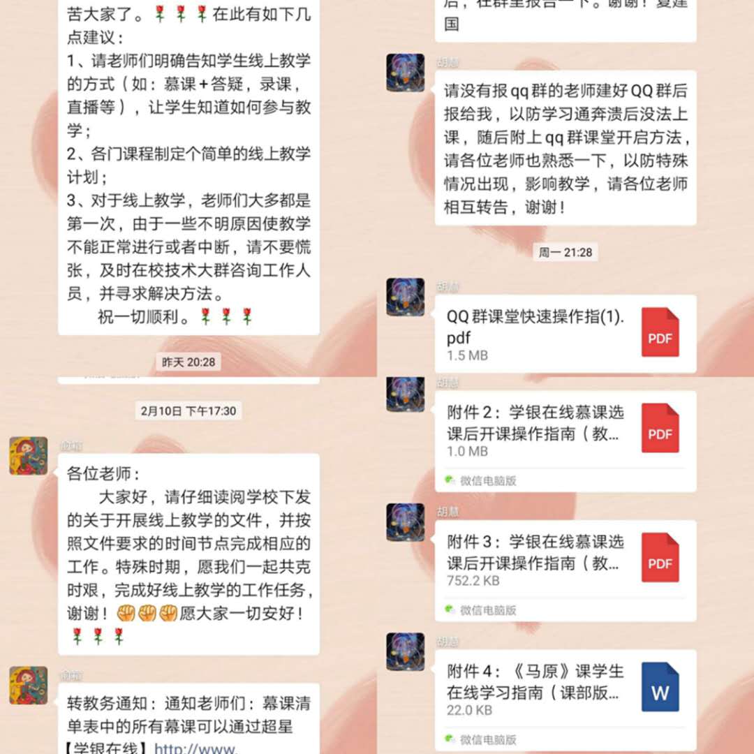 延迟开学期间,公共课部副主任俞霜老师、教学秘书胡慧老师积极组织全体教师积极学习网上授课软件,课部全体教师充分发挥主人翁精神,及时进入工作状态,做到“离生不离教,离校不离岗、离岗不离责”。在居家办公期间,公共课部各教研室紧密联系,充分利用微信等各类网络平台,召集部门会议,交流、研究、部署有关工作。