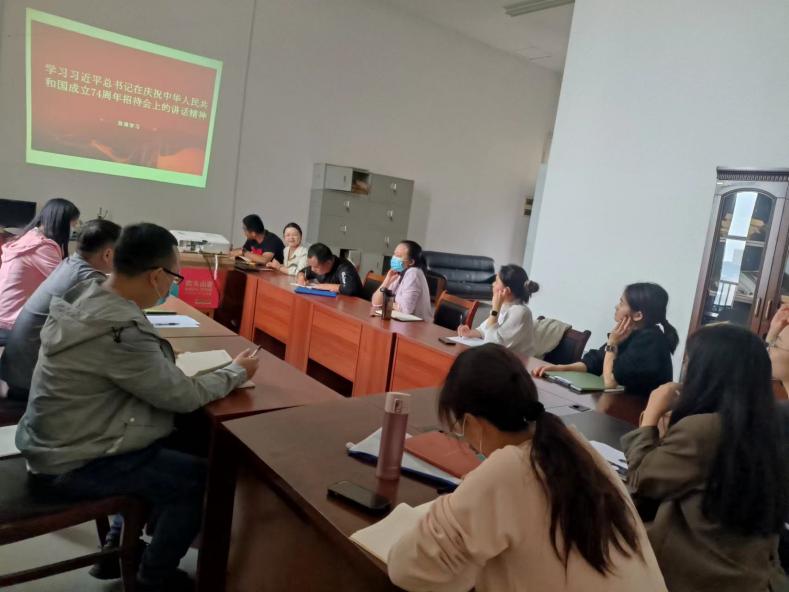 会议上周桂菊同志带领全体教师从致谢意、说成就、谈形势、讲对策、阐立场、话未来等六个板块深入学习了习近平总书记在庆祝中华人民共和国成立74周年招待会上的讲话全文。今年是贯彻落实党的二十大精神开局之年,74年来,我国由一穷二白到全面小康,已踏上以中国式现代化全面推进强国建设、民族复兴的新征程,这是中国共产党团结带领全国各族人民艰苦奋斗取得的巨大成就。这些成绩来之不易、令人振奋。但与此同时机遇与挑战并存,需要我们继续立足于国内外形势和基本国情,统筹好发展和安全问题,深入贯彻新发展理念、积极构建新发展格局、深入推进“一带一路”建设,扎实推进共同富裕,努力推动构建人类命运共同体,共创人类美好未来。