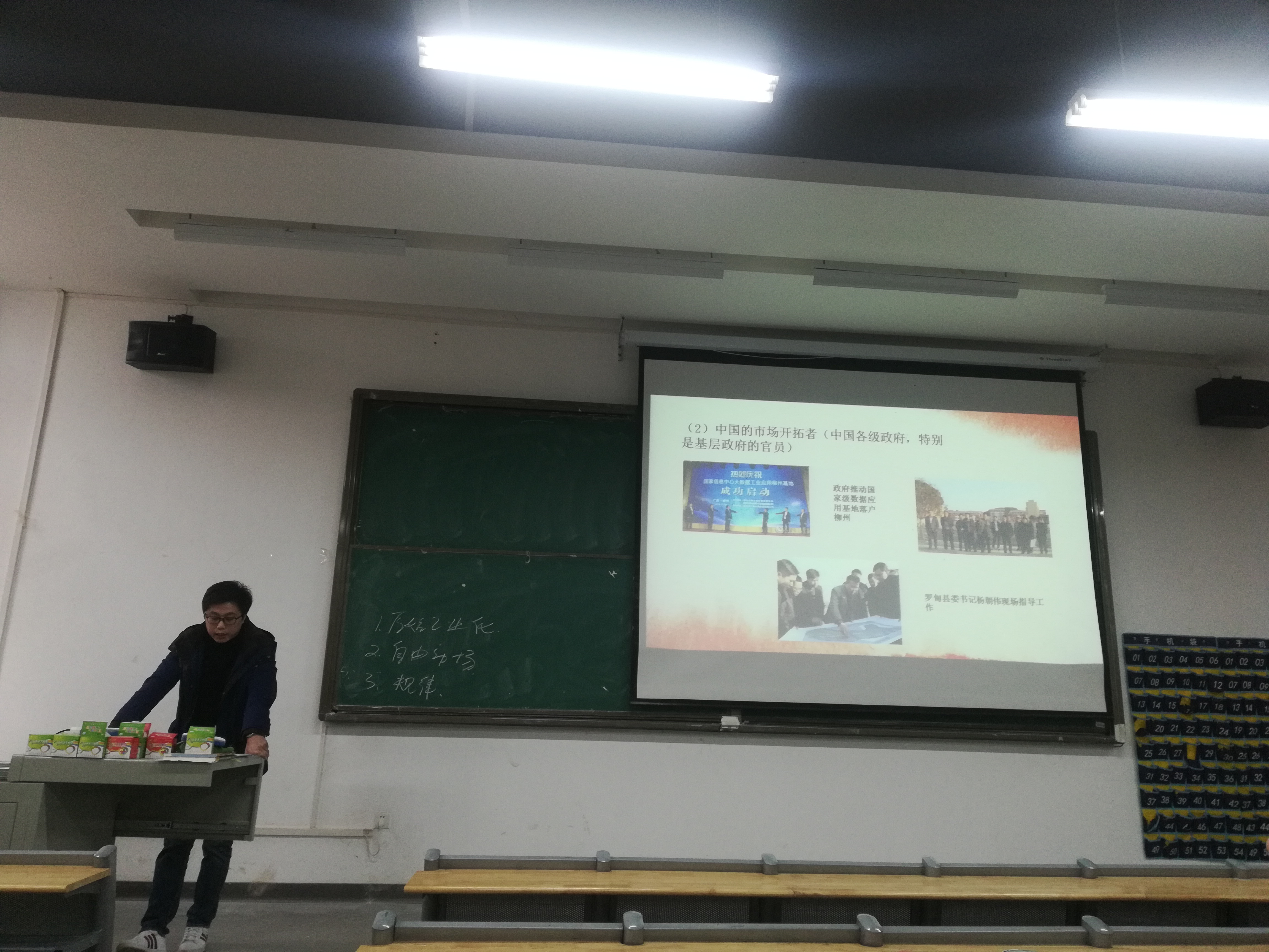 讲座以张乐老师提出的工业革命是人类历史上的一道分水岭正式开始,表明了革命在一个国家发展过程中发挥着巨大的作用。张老师向同学们介绍了英国工业革命的产生,通过将英国与荷兰两国支柱产业的对比,向我们详细介绍了首先开展工业革命的国家是英国而不是荷兰的原因。表明英国商人花了将近两个世纪,才打通了全球棉纺织业市场。他们在非洲掠夺奴隶,送到美洲殖民地种棉花,原材料运回本国加工生产,再把产品倾销到全世界。得出结论“自由市场既不免费,也不自由是一个很昂贵的公共产品”。紧接着,由英国的工业革命引入中国近现代工业的发展,介绍了20世纪80年代的中国农村,随着改革开放的深化,中国村镇工业化的发展以及乡镇企业的发展热潮。并表明中国在计划经济时代就奠定了把分散的农民组织起来合作的基础以及我们有一个特别给力的市场创造者(各级政府,特别是基层政府的官员)是中国完成市场创造的两大因素。“中国制造”在世界市场上保持着很大的优势,中国经济的崛起、赶超,迄今已是世界第二大经济体。